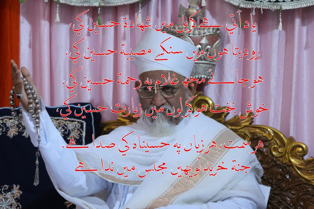 The beginning of the New Year brings the Divine Message of "Hasanaat", goodness and gracefulness for mumineen. The great month of Moharram ul Haraam is marked with the mourning on the grandson-Sibt of our Nabiyullaah Mohammad ul Mustafaa SAWS, Maulaana Imaam Husain AS. The beings on this land and in the heavens engage themselves in this mourning that brings Hasanaat. We as a Mumineen of Maulaa Husain AS are blessed with the choicest Hasanaat as we have Ma'refat of our Imaam with Jism-o-Jaan. Da'i-e-Husain in his complete capacity make mumineen believe the reality and truthfulness of the Waaqe'ah-e-Karbalaa. This pur-dard waaqe'ah and Shahaadat encompasses all the sacrifices and hardships from the first Nabi of our Islaam till the Imaam of Qeyaamat.