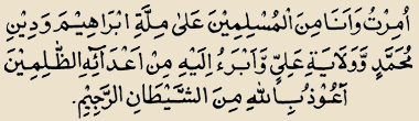 Translation : - I have focused my attention towards Allah who has created the heavens and the earth. I am standing before Allah as a true Muslim and I am not one of those who associate someone with Allah ( mushrekeen ). Indeed my prayers, my sacrifices, my life and my death are all dedicated to Allah Who is the Sustainer of all the universes and Who has no partner. I have been ordered to pray and I am proud to be one of those Muslims who believe in the tenets of Ibraheem (as) and the teachings of Mohammad (saws) and are steadfast in the love of Ali (as) and who keep away from the enemies of Ali (as) since they are tyrants. I seek refuge before Allah from the devil who is the cursed one.