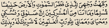 Transliteration : - “Wajjahto wajhiya lil lazee fataras samaawaate wal arza haneefan musleman (hameefatan muslematan, for women) wa maa ana minal mushrekeen. Inna salaatee wa nosokee wa mahyaayaa wa mamaatee lillahe Rabbil aalameen. Laa shareeka lahoo wa be zaaleka omirto wa ana minal muslemeen alaa millate Ibraheema wa deene Mohammadin wa walaayate Aliyyin wa abrao ilaihe min aadaa-e-hiz zaalemeen. Aoozo billahe minash shaitaanir rajeem.”