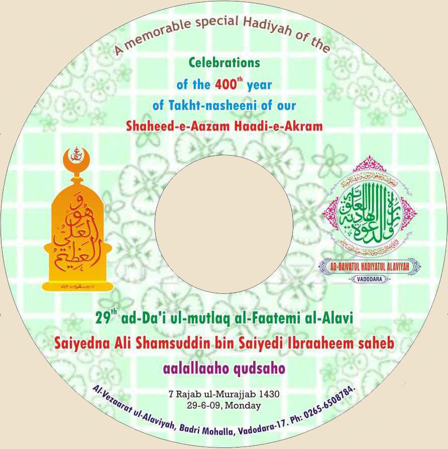 The memories of the functions of the 400th year of the takht-nasheeni of our 29th Da’i ul-Mutlaq Shaheed-e-Aazam Saiyedna Ali Shamsuddin bin Saiyedi Ibraheem (aq) is still afresh, the committee members who had organized all these thought to keep alive the reminiscences of the jashn-e-alavi of our Muqaddas Maula for years to come and mumineen should forward and preserve the glimpses of this spectacular memorable events to their posterity. To achieve this goal, the members composed and edited the videos and snaps of the entire program and made a DVD which is ready to be distributed hadiyatan to the mumineen who donated their paak daulat in this noble cause of Muqaddas Maula. Apart from the donors those who wish to obtain this DVD should contact Al-Vezaaratul Alaviyah at the earliest.