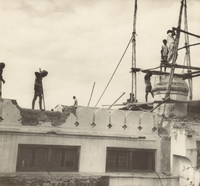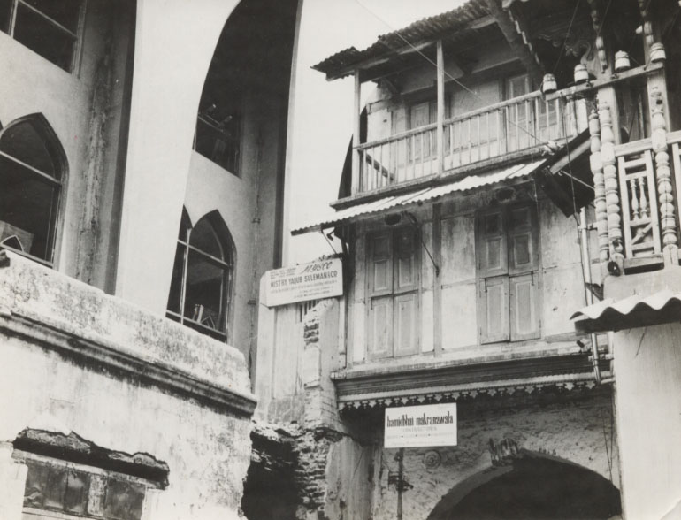 Masjid par qibla ni diwaar saathe 2 khoob-surat naazuk minaar hata. Tasweer ma mazdoor tene shaheed kari rahya che te nazar aawe che.