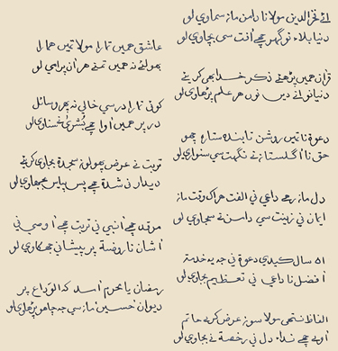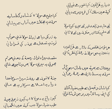 He was a brilliant, extraordinary, incomparable, unique and outstanding poet, versifier, wordsmith and writer who wrote and quoted verses regarding creation, knowledge, death, obedience to Da'i, khidmat, darajaat of mumineen, Ramazaan, Moharram etc. He also composed unparalleled verses for the praise of Allah, Ahl ul-Bayt (AS) etc. |