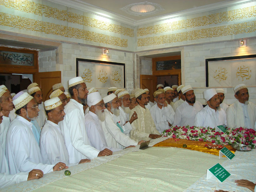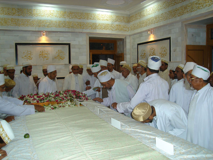 Maazoon Saheb (DM) halted near the qabr-e-anwar of Muqaddas Maula and among a huge crowd he made the qabr as the centre of discourse and addressed mumineen and said, “O Maula, you are indeed endower of our wishes and answerer to our difficulties, your mausoleum and qabr-e-mubaarak is the place of calmness and tranquility for all the believers and mumineen. When we come at your service, when we take your name, when we take your entreaty (waseelah), all our difficulties and hardships melt away; all our disappointments and misfortune vanishes away; we feel like in the company of Almighty and we see a ray of hope in all our wishes. Just as we spend for the Khidmat of your mausoleum, majlis and ta'aam of Behram and ‘Urs from our wealth; O Maula, in the reward of our service in your way, bestow our homes with the bounty of piousness, religiousness, kindness and moral character. Glorify the hearts of mumineen with knowledge, awareness and understanding to follow Seraat ul-Mustaqeem. The most precious gift of Allah to the mankind is health.” Concluding his speech, Maazoon Saheb (DM) assuming the spiritual presence of Muqaddas Maula in the mausoleum, prayed for the health of all mumineen and took the plea of Maula for the well-being and the progress of our Alavi jamaa'at. |