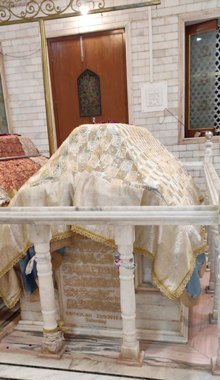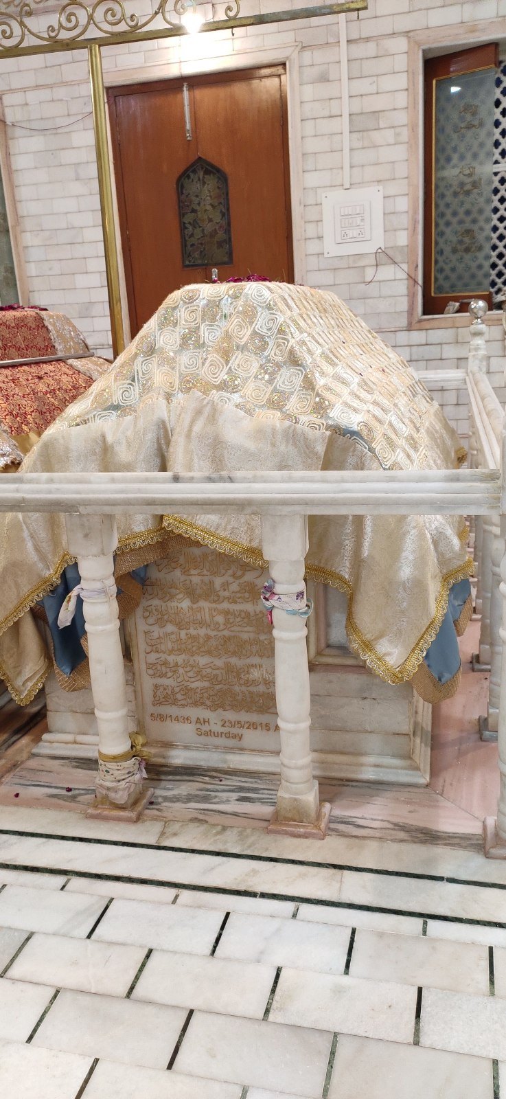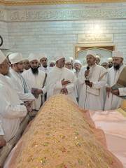 On the occasion of Shab-e-'Urs of Muqaddas Maulaa, Huzoor e ‘Aali Saiyedna Haatim Zakiyuddin Saheb TUS elucidated the meaning of Qabr and the great majma' with the Da'i e Haqq. Hudood recited the qasidah "Aye Baawaaji Saheb" at the Qabr e Anwar in Mazaar e Yusufi. Maulaa adorned the Qabr e Anwar of Muqaddas Maulaa with the Ghilaaf brought from the Zareeh e Athar of Maulaatona Sakina bint Imaam Husain SA from Baab e Sagheer Qabrastaan, Damascus. When Raasulhudood Saheb ZI was on the Ziyaarat Safar of 'Atabaat e 'Aaliyah in Syria, the Ghilaaf was presented by the caretaker of the Rozah as a Hadiyah to Saiyedna saheb TUS. On the return Huzoor e ‘Aali TUS wished that on the occasion of 'Urs Mubaarak of Muqaddas Maulaa, this Ghilaaf should be placed on Turbat e Taaherah Taiyebiyah so that Mumineen could take barakaat from it. |